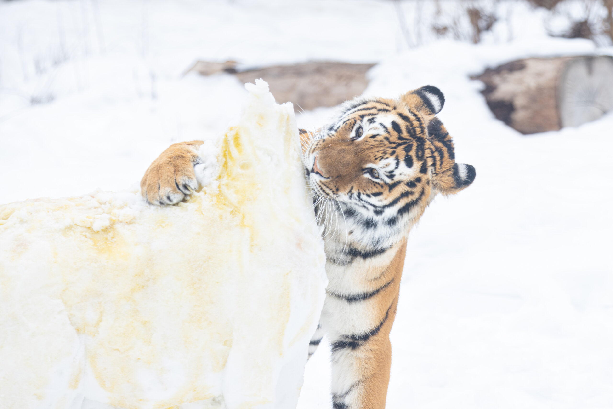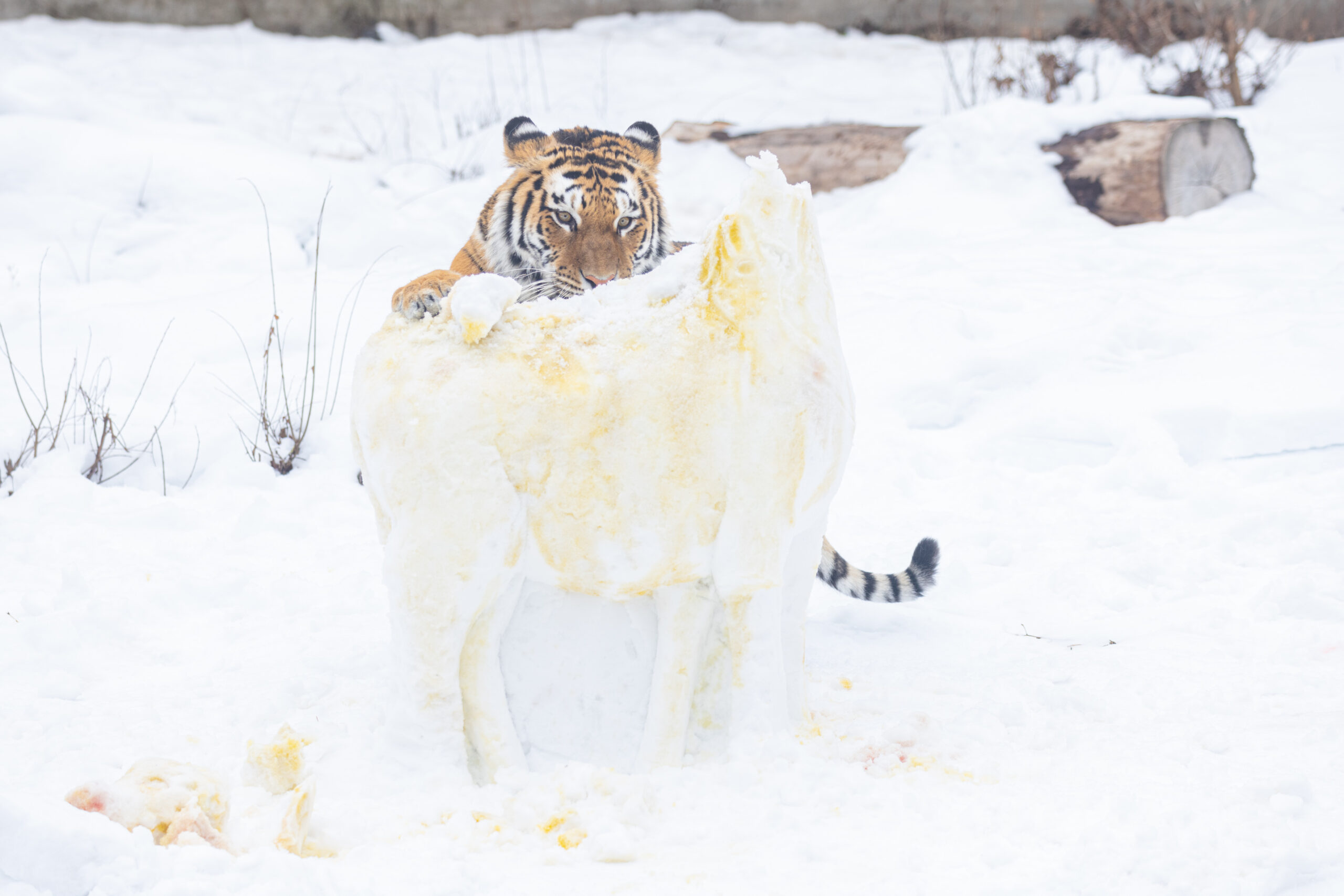 While this display was certainly an exciting one, it’s also beneficial enrichment for Ash. A sizable snow sculpture like this not only provides something fun and new for her to experience, but it also helps replicate natural behaviors, as if she was hunting down prey in the wild.