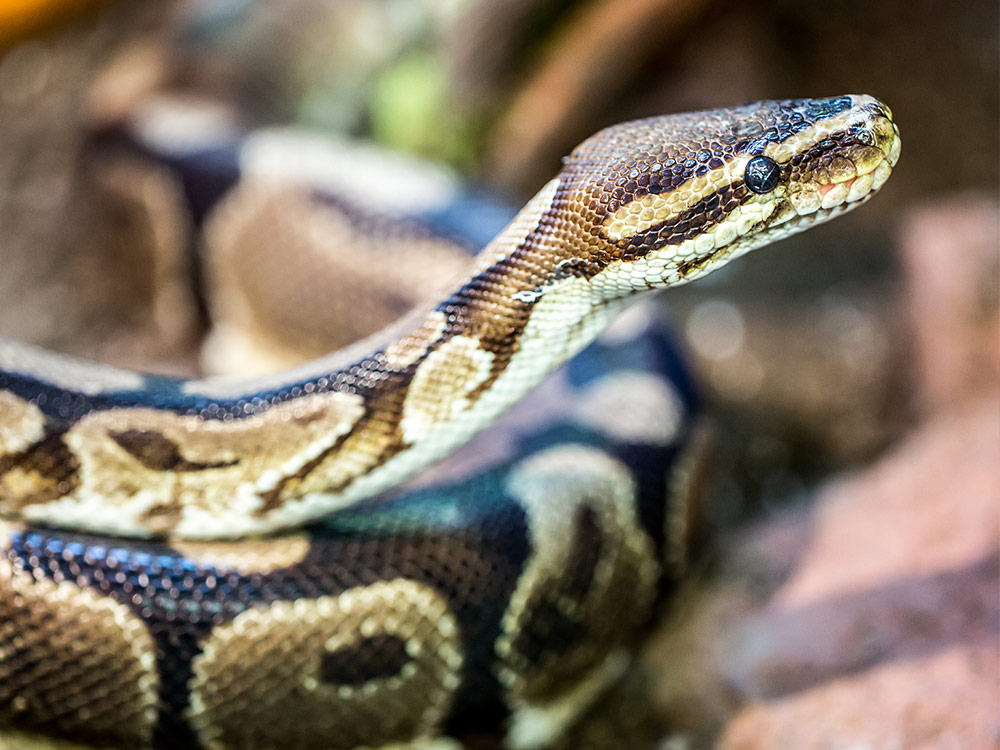 The ball python lives on the edges of forest lands, both on the ground and in the trees.