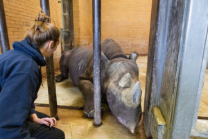 Recently, while treating his horn, keeper Sarah was crouched near Romeo when, unprompted, he laid down in front of her. Seeing an opportunity, she established her crouching down as a visual cue for Romeo to lay down.